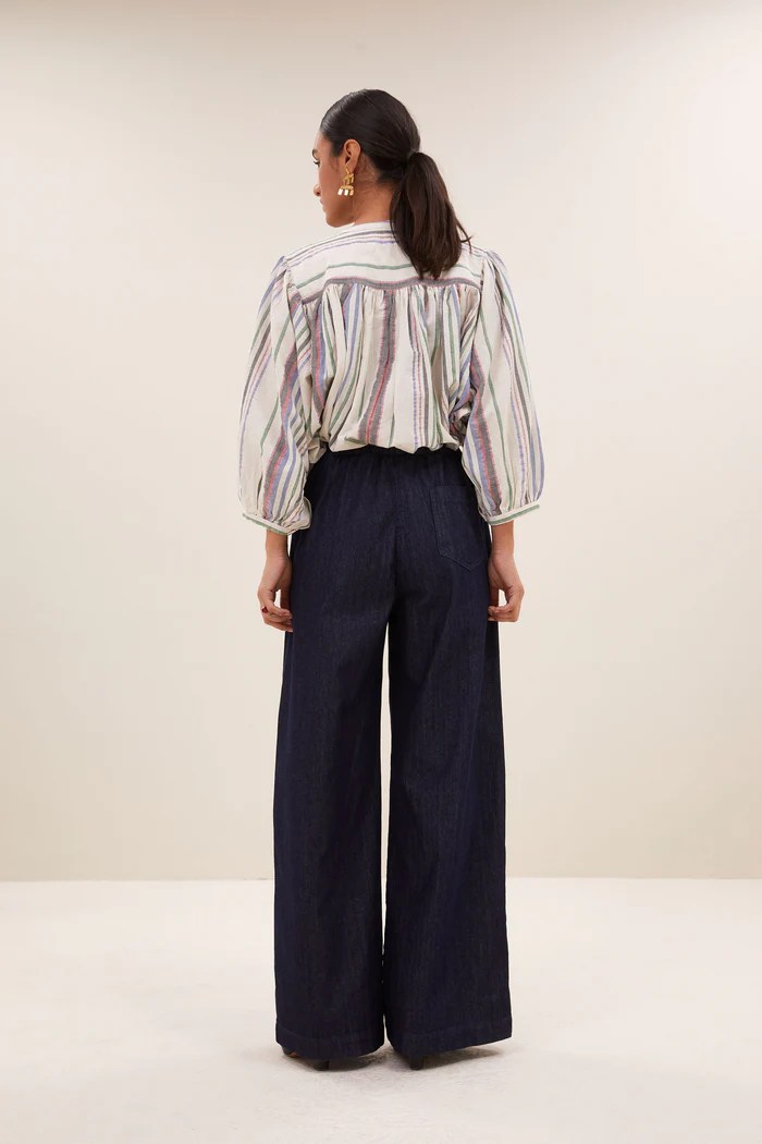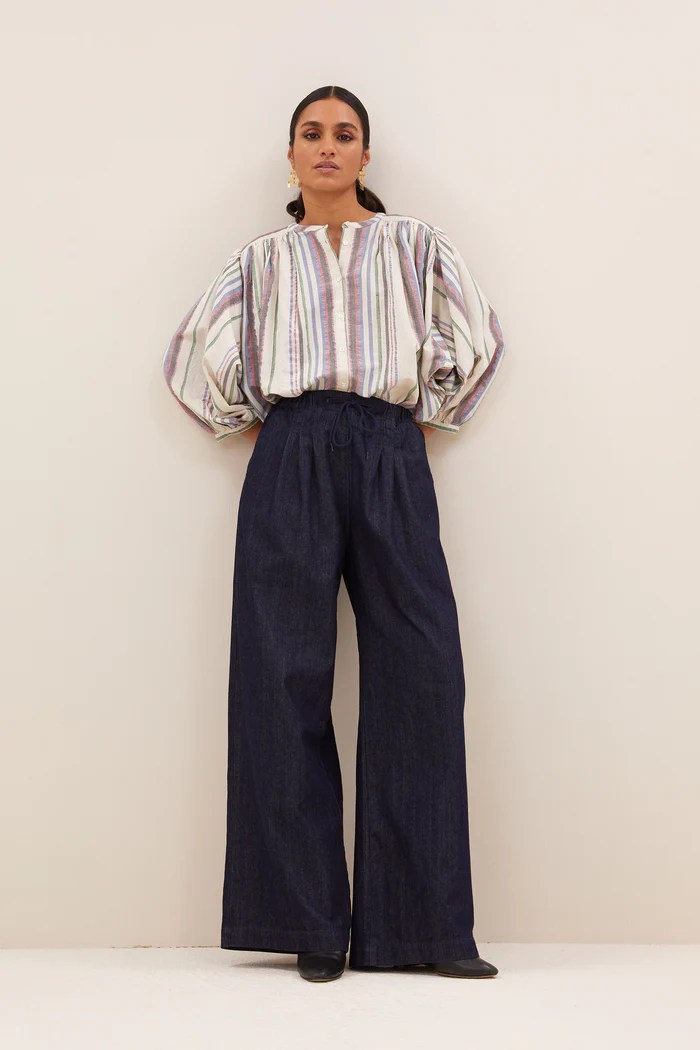 La blouse ample aux manches volumineuses, un classique de la collection By Bar. Confectionnée dans un coton rayé réhaussé de fines rayures de lurex.