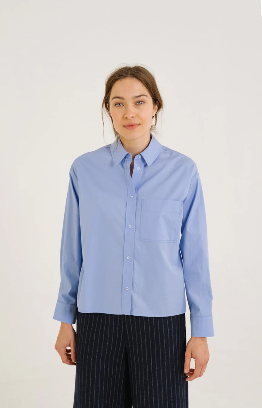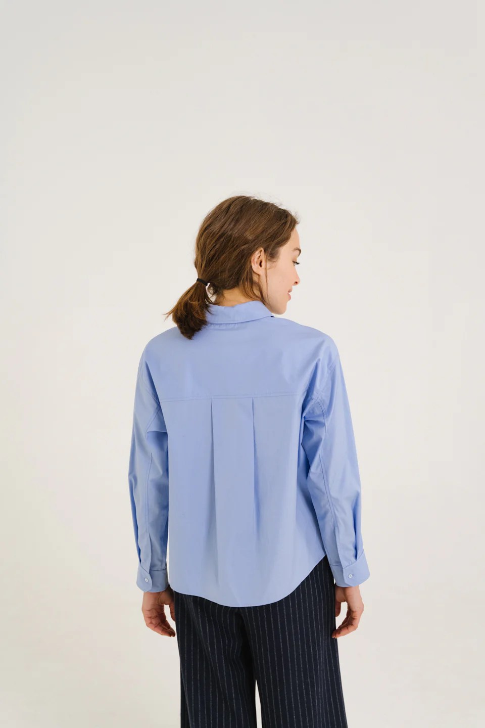 Une Chemise loose et courte à manches longues, confectionnée dans un coton de qrande qualité de couleur bleu ciel. Inspirée du vestiaire masculin elle se distingue des chemises d’homme par sa poches plaquée sur la poitrine.