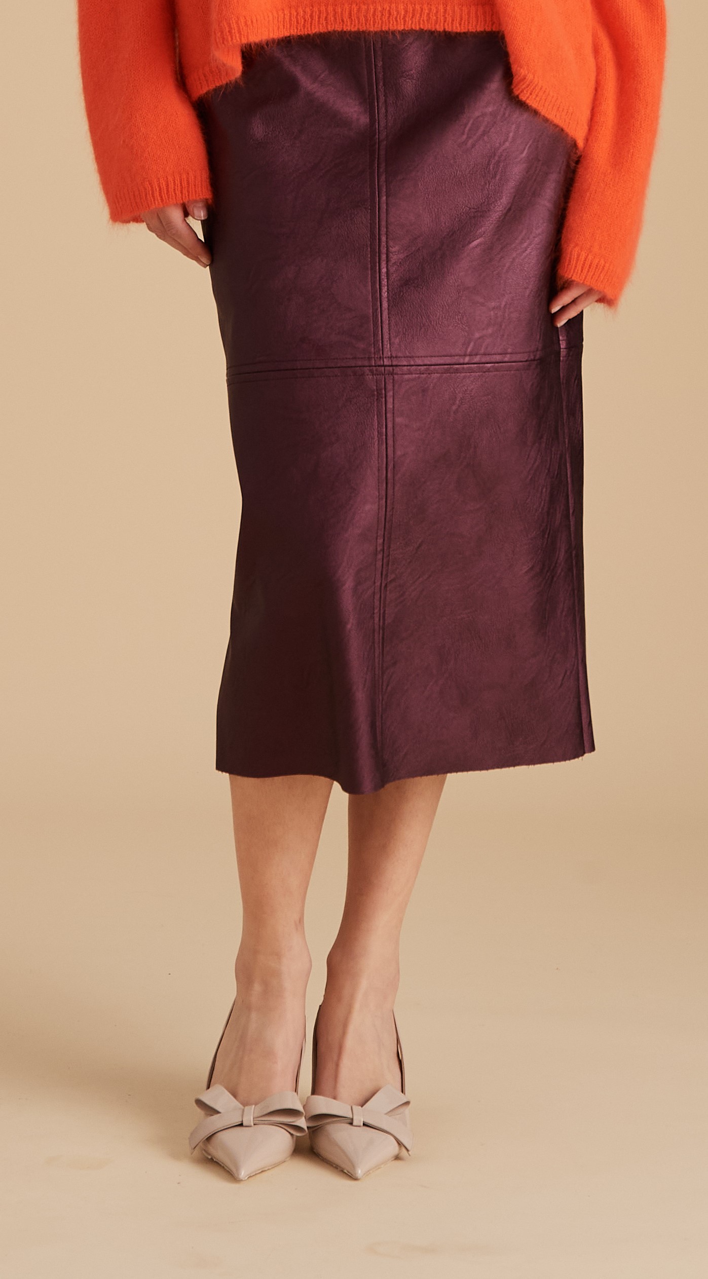 Jupe droite en simili cuir recyclé. Portée avec une grosse maille et des sneakers ou version ultra chic avec une chemise et des ballerines