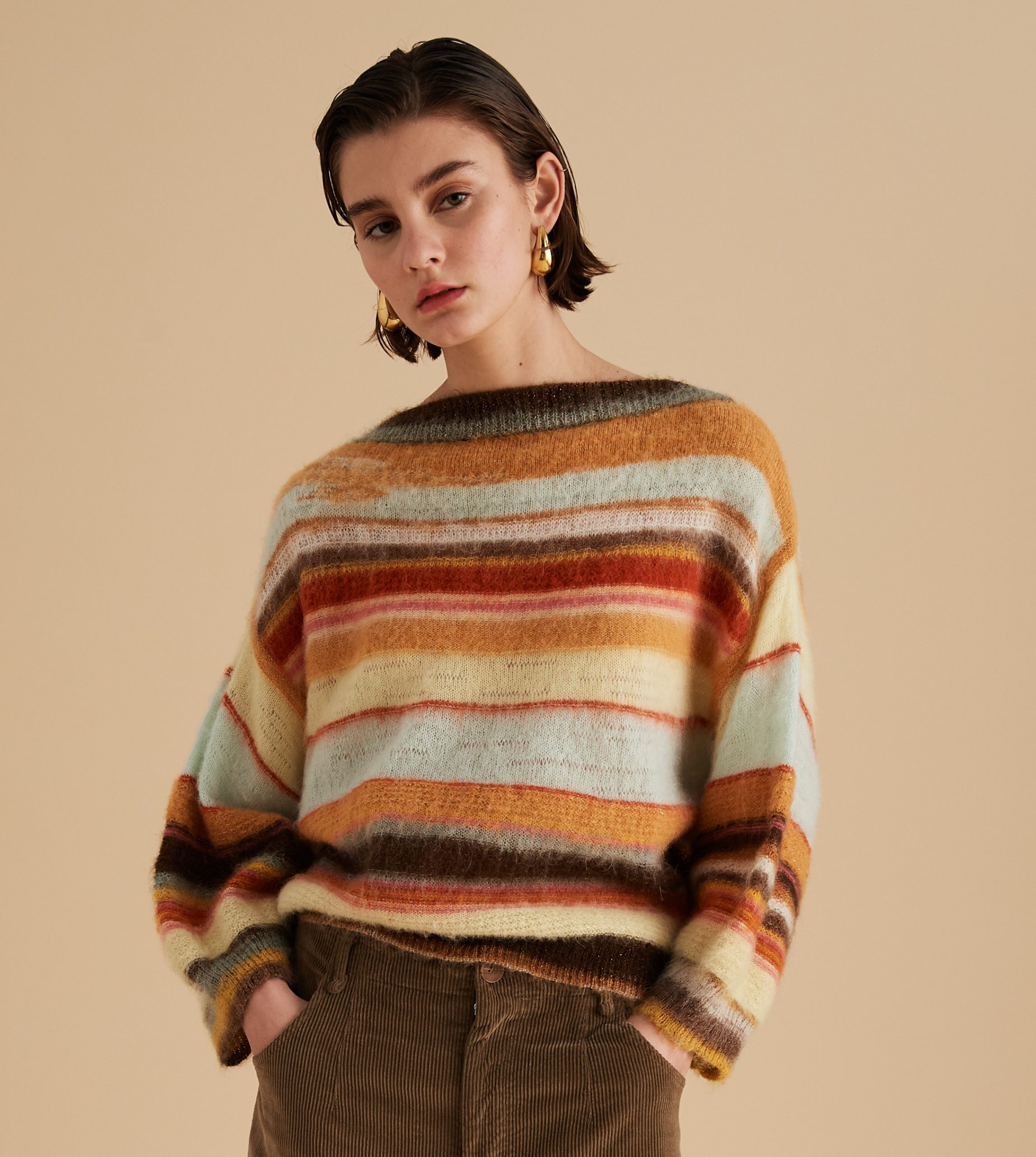 Un pull d’une douceur infinie. On aime ses rayures dans les tons de beige sable et marron glacés.