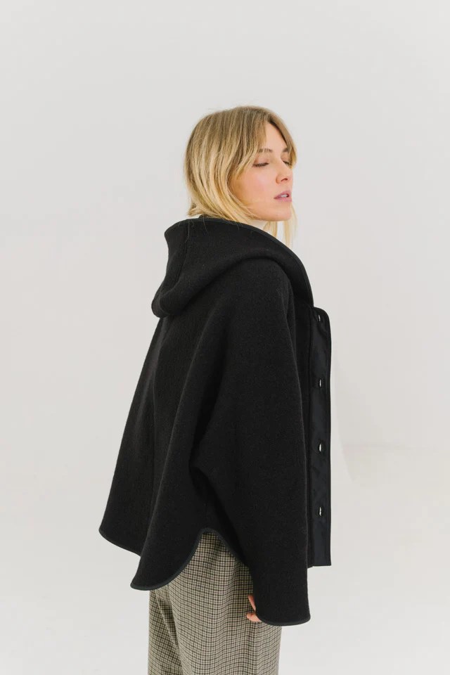 Veste ample esprit cape noire confectionnée en pure laine vierge bouillie.